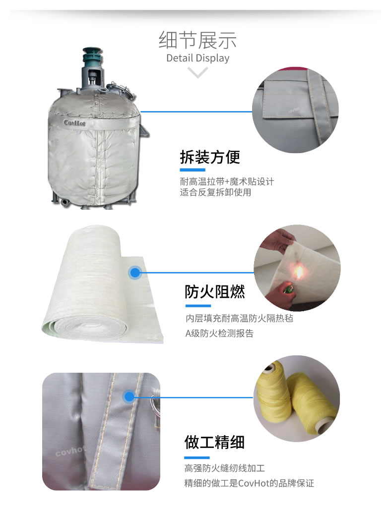 工業(yè)罐體保溫套無需專業(yè)保溫人員,無需專業(yè)培訓(xùn),操作簡單快速,表層纖維布不含石棉成分,防油、防水性能優(yōu)良,無纖維飛散問題,環(huán)保、安全、衛(wèi)生。隔熱保溫效果佳,耐溫可達1170度。具有易操作,節(jié)省維護時間和保溫成本。光澤、平整、美觀、使用壽命長、防雨、防酸堿、抗老化,柔軟,拆卸方便,重復(fù)使用,節(jié)能環(huán)保。解決了經(jīng)常拆卸部位難以重新保溫的問題,減少了能源浪費。